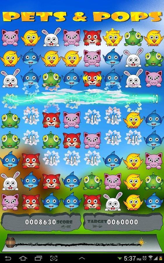 Kumpulkan tiga atau lebih hewan peliharaan dengan warna yang sama untuk membuatnya menghilang. Anda dapat membuat garis horizontal, vertikal atau miring. Untuk lulus ke tingkat berikutnya Anda harus mendapatkan target total.
